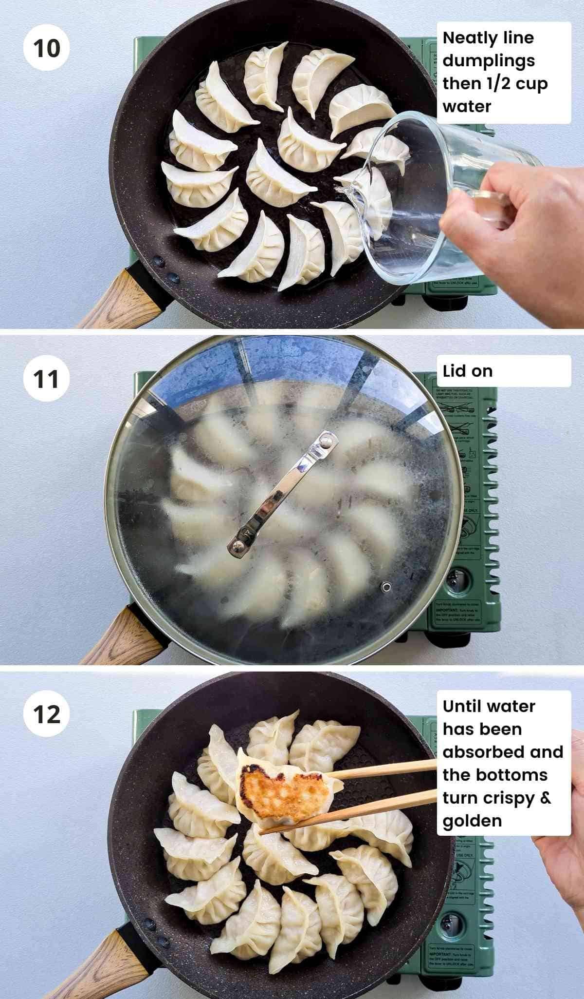 Cover the pan with a lid and let the dumplings steam for about 8-10 minutes. This steaming process will help the dumplings cook through while staying juicy on the inside.